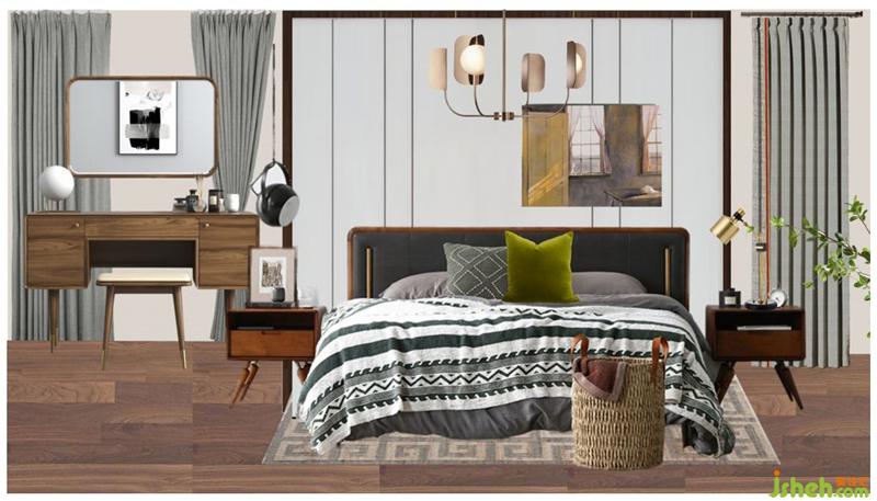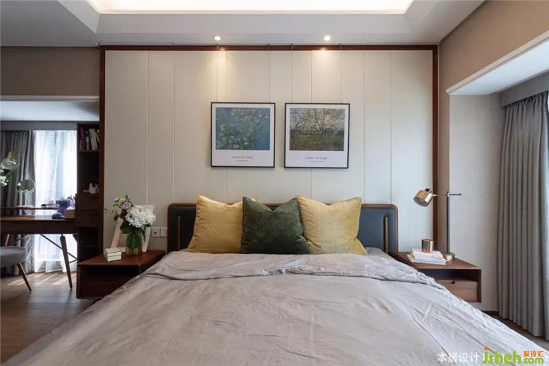 主臥家具采用了北歐表情中最受歡迎的堪培拉系列,實(shí)木的床頭柜與床架,精致的床頭柜設(shè)計(jì)細(xì)節(jié),圓潤的邊角線條,上層敞開式的儲(chǔ)物格,方便放取物品。床頭背景墻同樣掛上業(yè)主喜愛的梵高畫作。