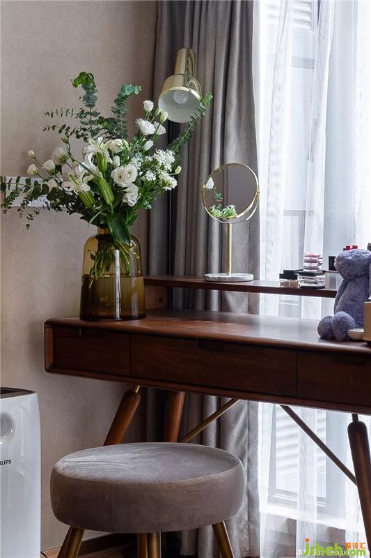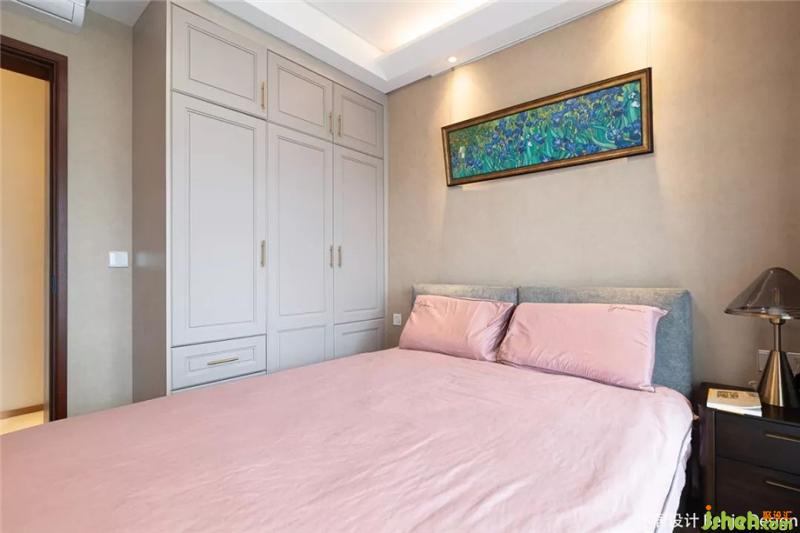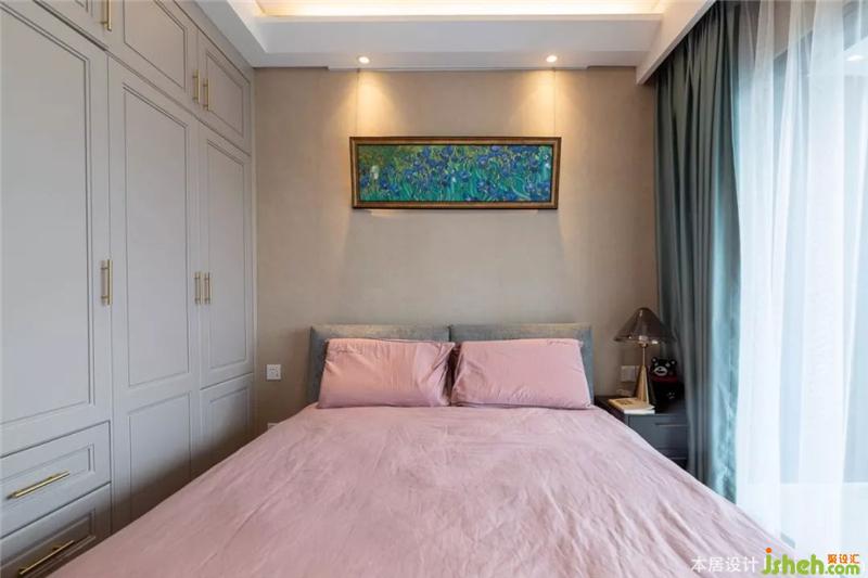 次臥與主臥風(fēng)格大不相同,使用面積較小,因此定制一整面立體柜,皮粉色四件套搭配湖藍(lán)色的窗簾,整體歐式風(fēng)格更突出。裝修設(shè)計(jì)