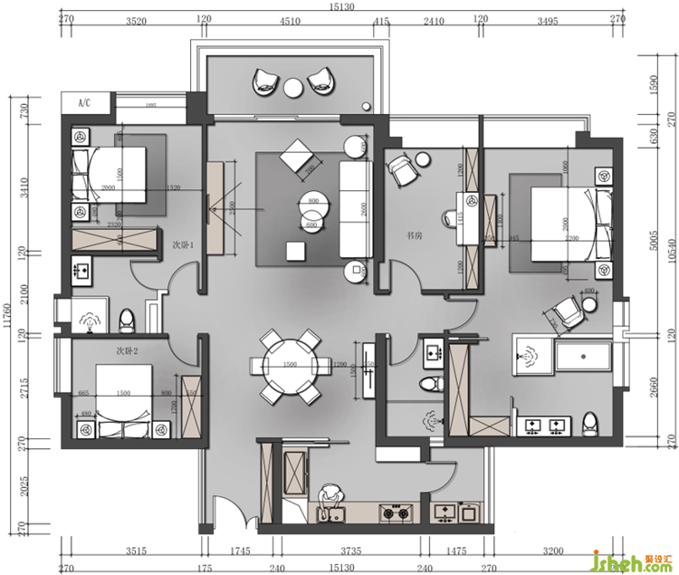 此案是華潤城潤府精裝房軟裝設計案例,室內設計師在原始精裝格局不變的情況下,做了如下軟裝的搭配與設計: