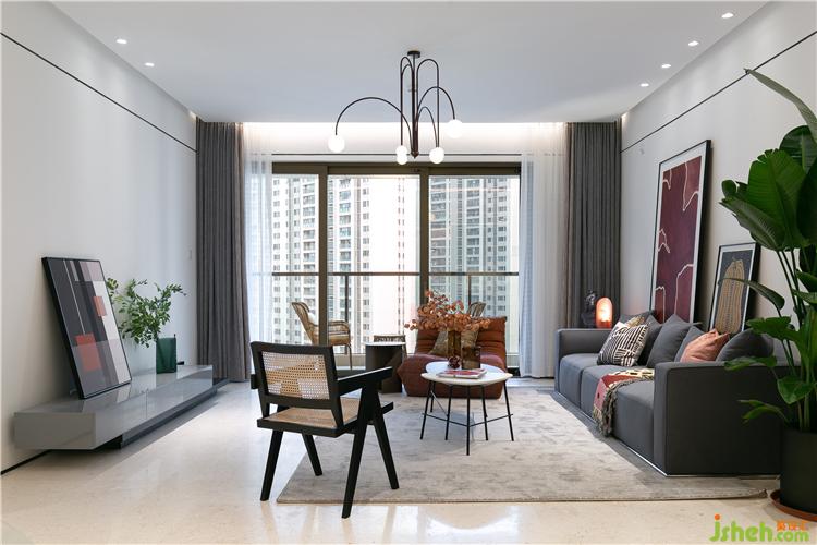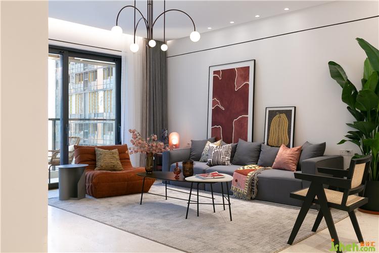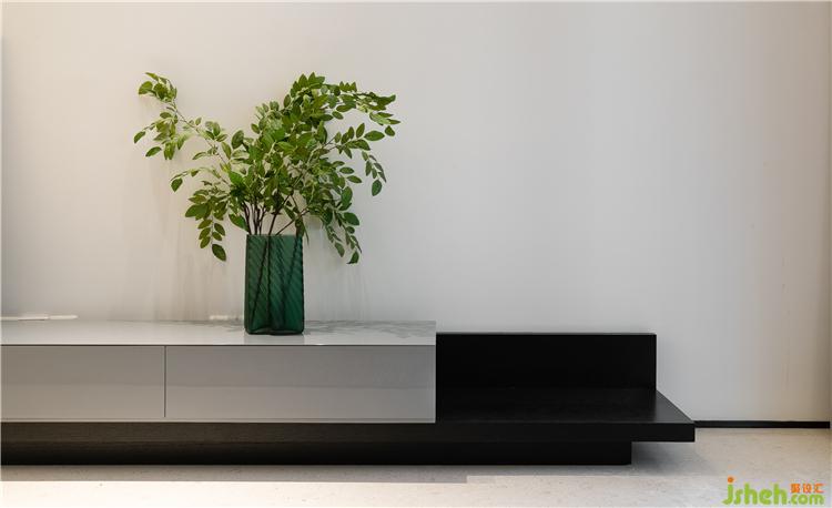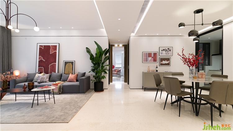 客廳的整體色調以白色+灰色為主,誠然在華潤城黑白極簡的硬裝基礎上,室內設計師需要為它注入鮮活的色彩,所以在空間中的軟飾,我們用了大量的紅色來點綴。在視覺焦點的沙發(fā)區(qū)域,用大幅的掛畫來營造視覺的沖擊感,以及塑造空間的藝術感。