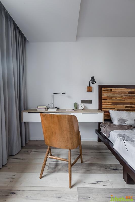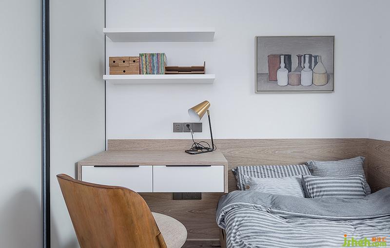 次臥室設(shè)計(jì)公司采取榻榻米形式,整體柜體和書桌現(xiàn)場木工制作,面貼KD板,一大排抽屜是比較實(shí)用的,可以放很多書籍,衣服等。
