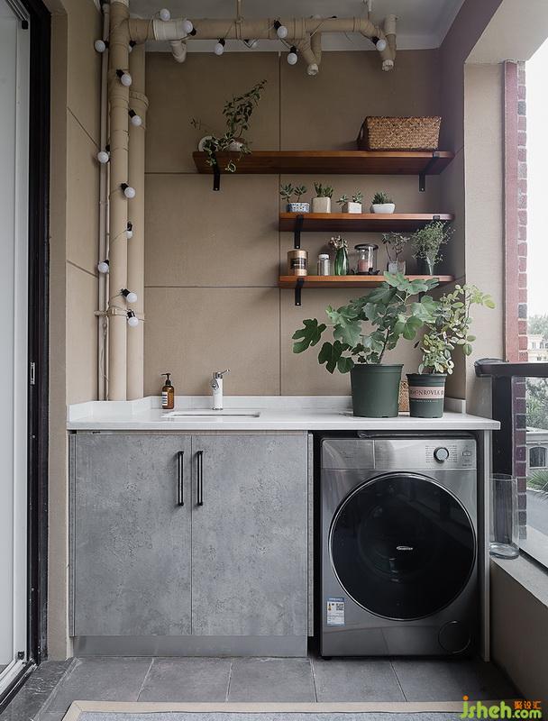 陽(yáng)臺(tái)設(shè)計(jì)了洗衣機(jī)和洗衣池,九十公分高度的合理設(shè)計(jì),讓屋主輕松洗衣。墻面長(zhǎng)短不一的陳板,巧妙的為細(xì)心的女主人提供了收納平臺(tái),放置自己喜愛(ài)的綠植。夜晚水管外的暖黃色燈光,給晚歸的家人,很強(qiáng)烈的歸屬感。