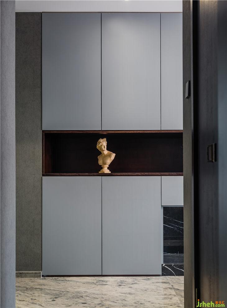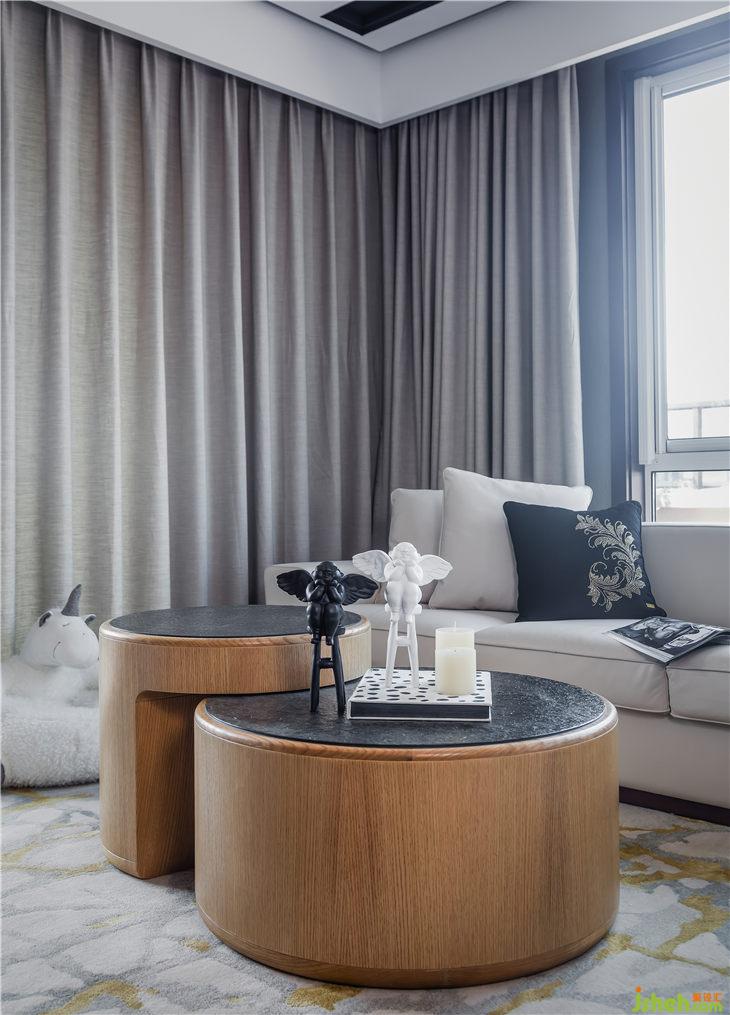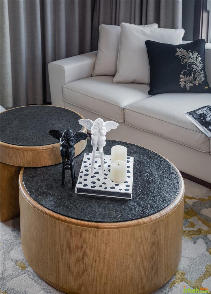 主要材料:藍(lán)色妖姬大理石 、黑白根大理石 、胡桃木色面板、無紡布壁畫、棉麻布料等