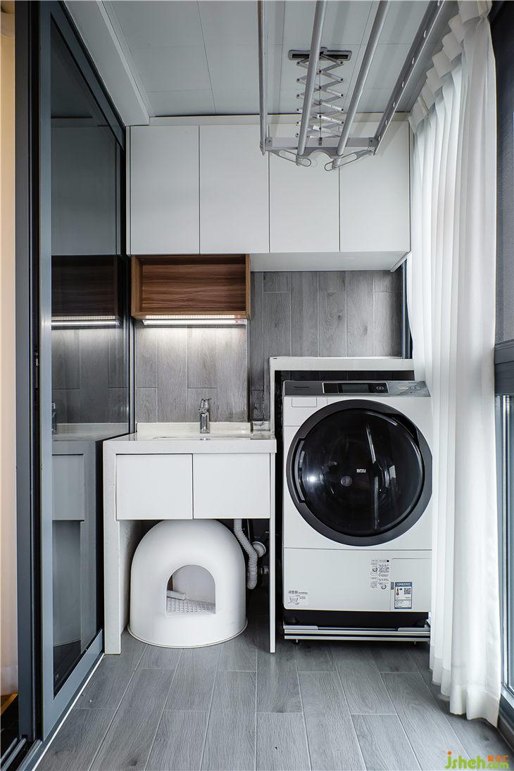這款洗衣機(jī)要比一般的要高,在一米左右。臺(tái)盆下留了比較高空間便于放貓窩在這里,柜子下的燈在夜晚能看到一些細(xì)節(jié)。頂柜線條利落大方,簡(jiǎn)約又大方。