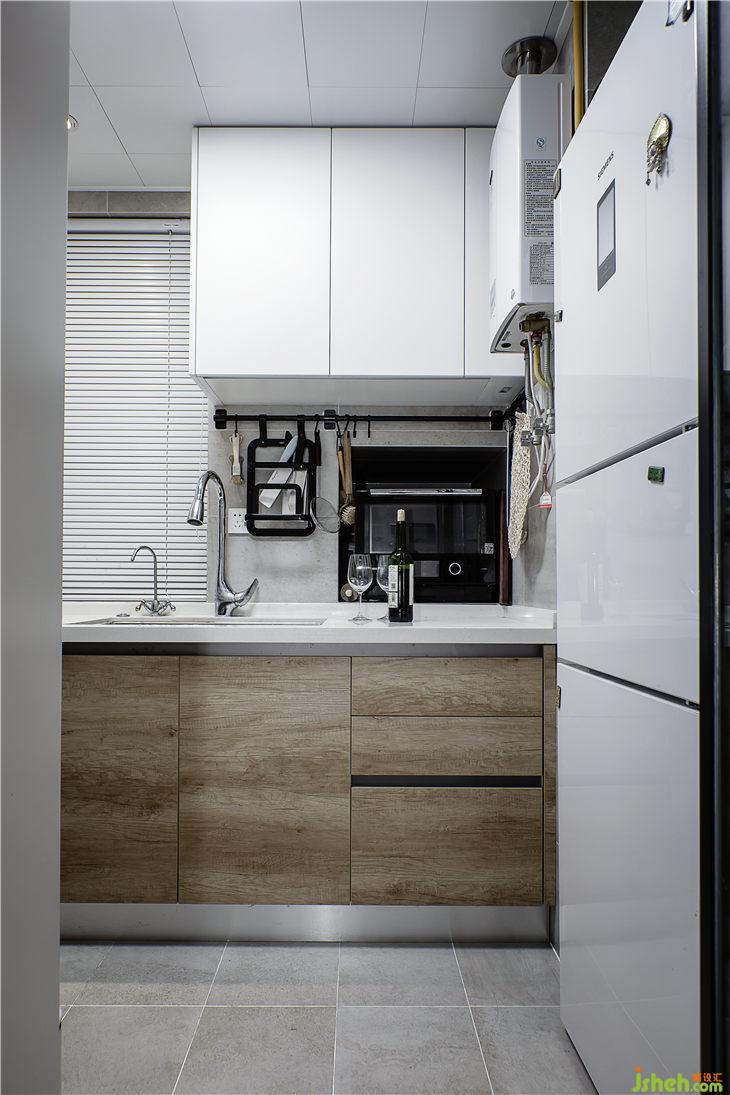 廚房安裝了百葉窗,關(guān)上便不用害怕做飯時(shí)的油煙,而玻璃的透明質(zhì)感使得空間明亮許多,白色的臺(tái)面和墻壁顯得簡(jiǎn)潔自然。