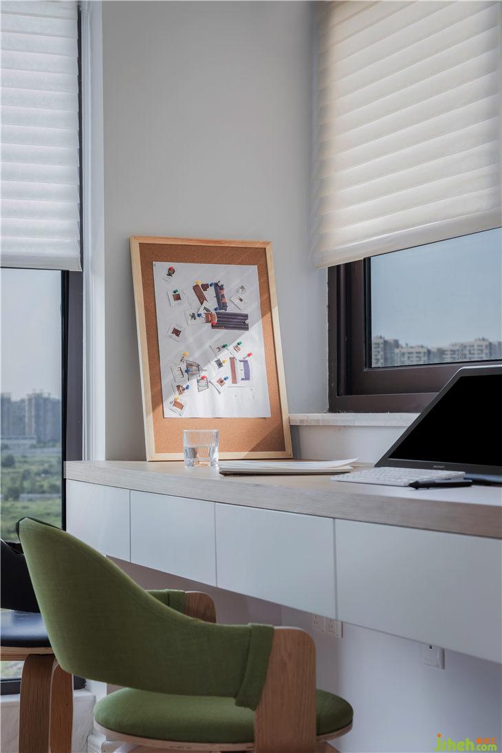 考慮到戶主工作的特殊性,窗簾采用了風(fēng)琴簾,陽光通過風(fēng)琴簾照射進(jìn)來光線更加柔和,創(chuàng)造了良好的工作氛圍。