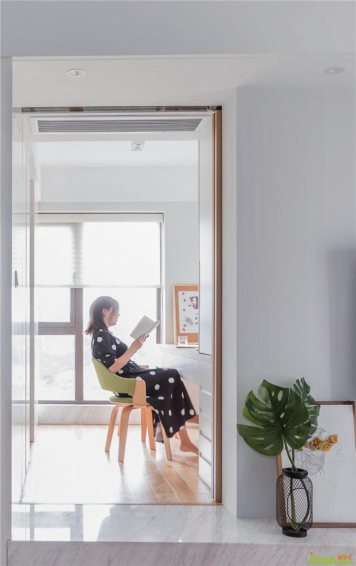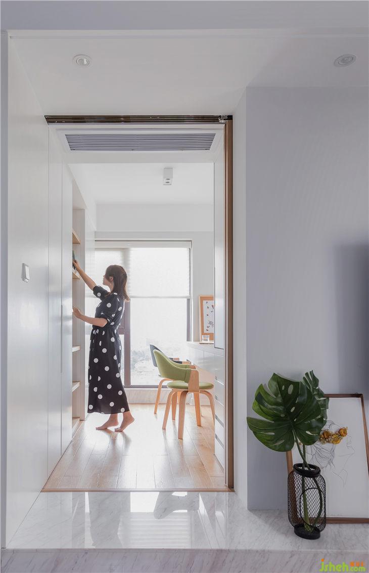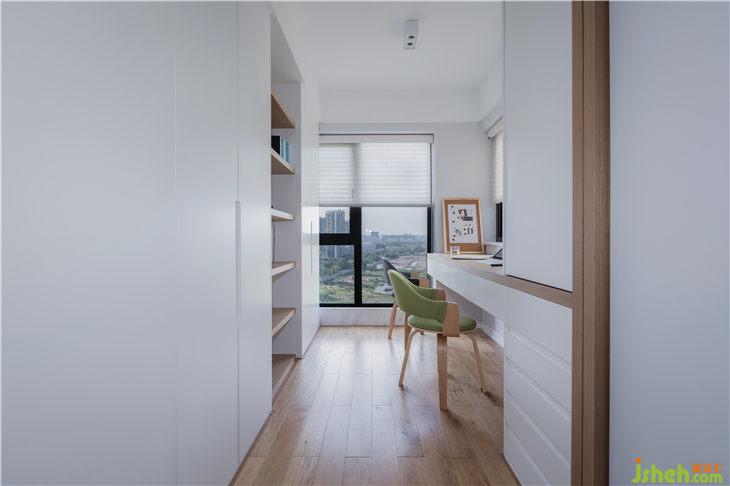 色彩上面以文藝白為基調(diào),搭配地面原木色的實木地板,綠色布藝靠椅為整個空間增添了一絲活力,開放式的書架,白色在整個空間內(nèi)一點也不無聊,硬軟裝的結(jié)合,流露出簡約的美感。