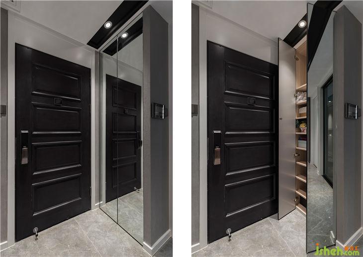 進(jìn)門左手邊的鞋柜是凸出廚房門的墻,采用鏡面門弱化了柜體,同時(shí)又能擴(kuò)大整體空間視覺(jué)感受!