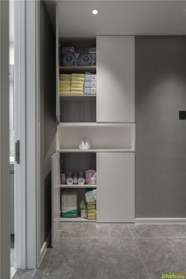 原客衛(wèi)的門是正對(duì)著進(jìn)戶門十分不好,因此把衛(wèi)生間門向左改動(dòng)。同時(shí)在右側(cè)做了90公分長(zhǎng)20公分深海柜收納柜,平時(shí)放一些常用的日用品。