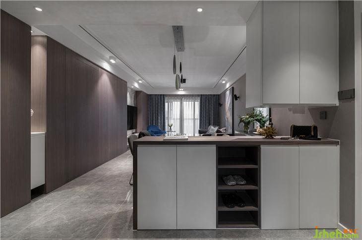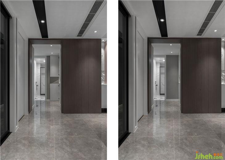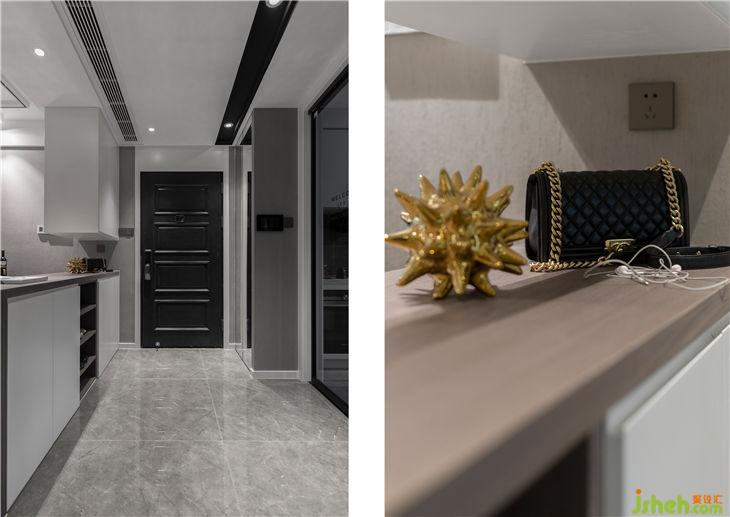 進(jìn)門右手邊是一排鞋柜和一個(gè)小吊柜。因?yàn)殡娞菰谶M(jìn)戶門邊上,考慮到出電梯的人直接能看到主臥室的門,設(shè)計(jì)一個(gè)小吊柜可以遮擋視線的同時(shí),又可以增加餐廳用餐的私密性!
