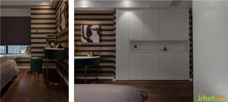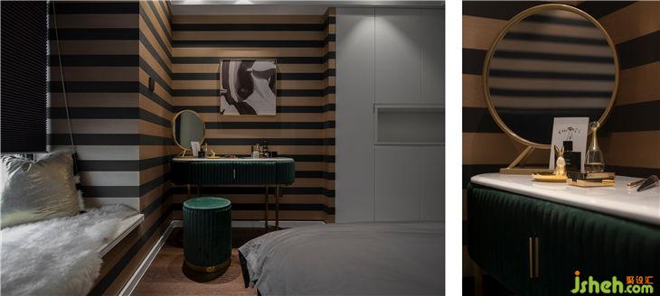 祖母綠絨面化妝臺、香檳金的圓鏡搭配著黑金條紋墻面,高貴又謙和,精致且細(xì)膩,使整個家居空間在品質(zhì)得以升華,同時也能夠表達(dá)出屋主對生活品味及生活質(zhì)量的追求。