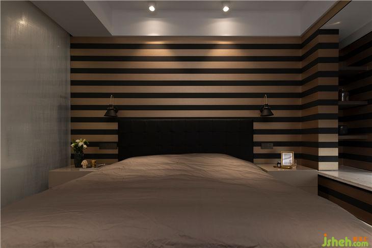 臥室以黑色和金色為主調(diào)呈現(xiàn)安靜時尚的氛圍,條紋墻紙與包豪斯臥室家具相得益彰。