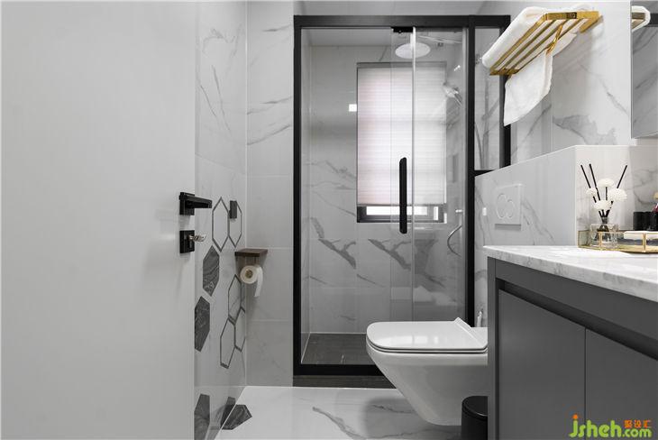為了清潔馬桶方便,采用掛壁式馬桶,臺盆柜下面放置地暖分水閥,十分方便。