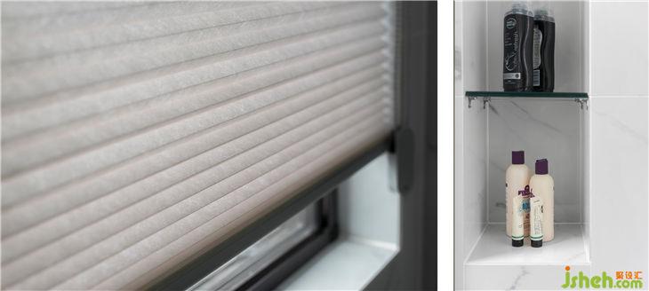 次衛(wèi)淋浴房的窗簾是采用的蜂窩簾,能遮掩的同時(shí)又很有輕薄感~
