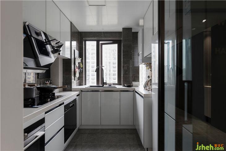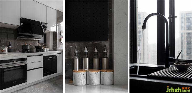 廚房門采用2公分寬黑色邊框透明鋼化玻璃門,廚房在墻面用了黑色瓷磚、石英石臺面、白色烤漆玻璃的柜門,黑白的經(jīng)典搭配充滿著時(shí)尚感,上方的吊柜配合身高和使用習(xí)慣做了上開門設(shè)計(jì),細(xì)節(jié)上的優(yōu)化和改變讓生活更方便。