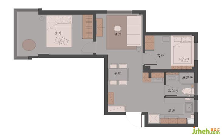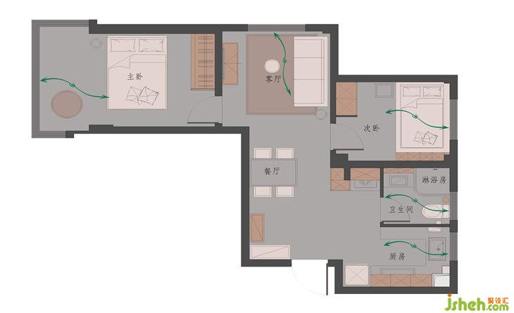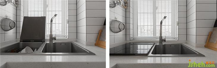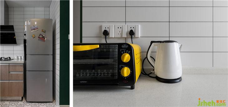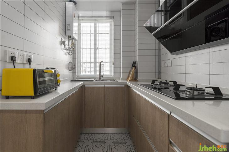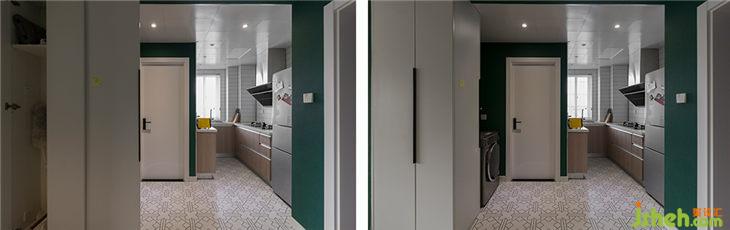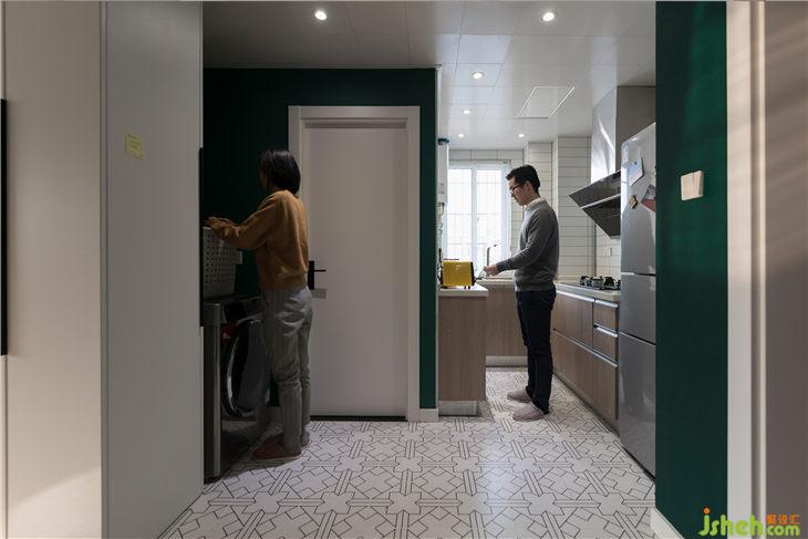 廚房和衛(wèi)生間原先的墻體拆除砌成薄墻,將現(xiàn)在進(jìn)入衛(wèi)生間的門洞封住,把廚房和衛(wèi)生間的區(qū)域分離開來(lái),廚房變身U型廚房。這樣除了正常布局外,增加了一排窄的柜子放置小家電。