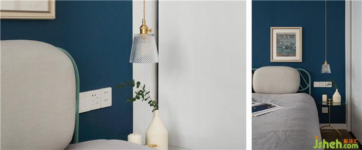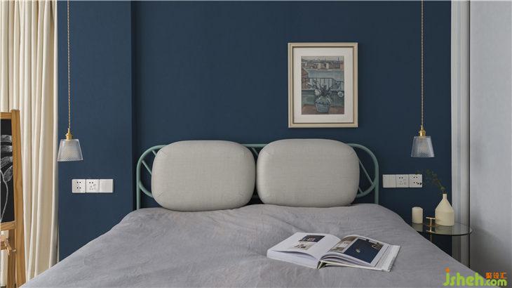 在三面留白的襯托下,海軍藍(lán)的床頭背景墻,整個(gè)空間凸顯了一種獨(dú)特的寧?kù)o感。