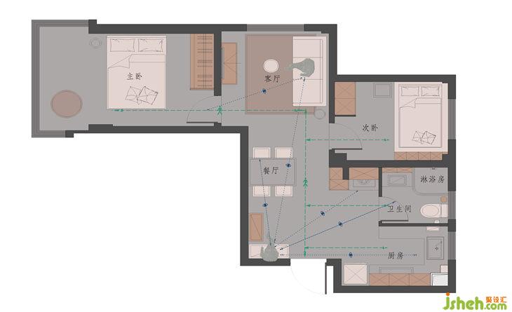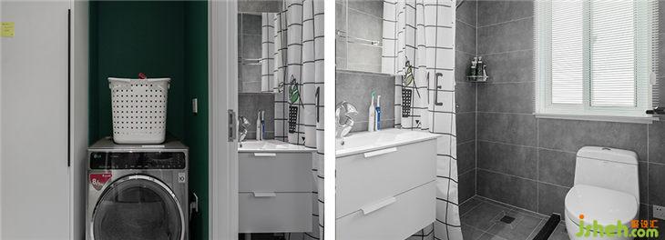 衛(wèi)生間的部分原先設(shè)想是,實(shí)現(xiàn)干濕分離。將洗衣機(jī)+臺(tái)盆區(qū)域和濕區(qū)分離開來(lái),可沒想到,拆除完之后發(fā)現(xiàn),蹦出來(lái)個(gè)水管(也就是原先鞋柜后面的位置)。淋浴房面積較小,我們采用的是浴簾的形式,又不相把洗衣機(jī)放在里面,于是決定,將洗衣機(jī)+臟衣籃及收納的部分放在外面,臺(tái)盆+淋浴房+馬桶的區(qū)域放在里面的空間,也就是現(xiàn)場(chǎng)呈現(xiàn)的方案。