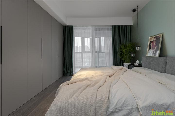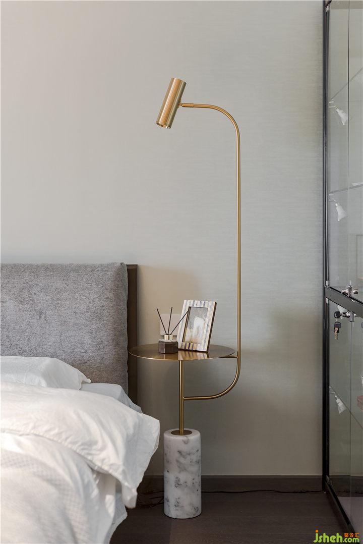 靜謐的色調(diào),賦予了空間寧靜的氛圍。黃銅落地架綴,復(fù)古綠窗簾做為空間的亮色調(diào)。