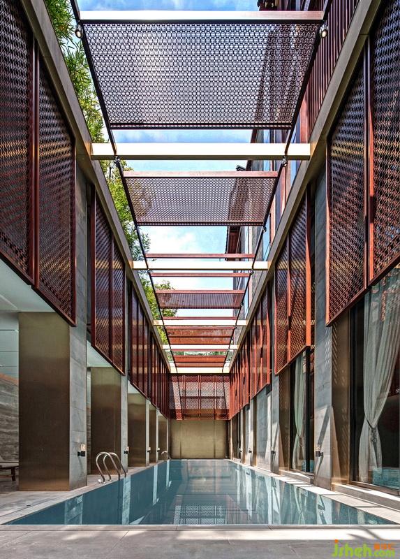 室外是斑彩熠熠的泳池,鏤空格柵天窗處理,使得光與影交錯互映,在室內(nèi)外的交融對話中雕琢著一番生機豐沛的景象。