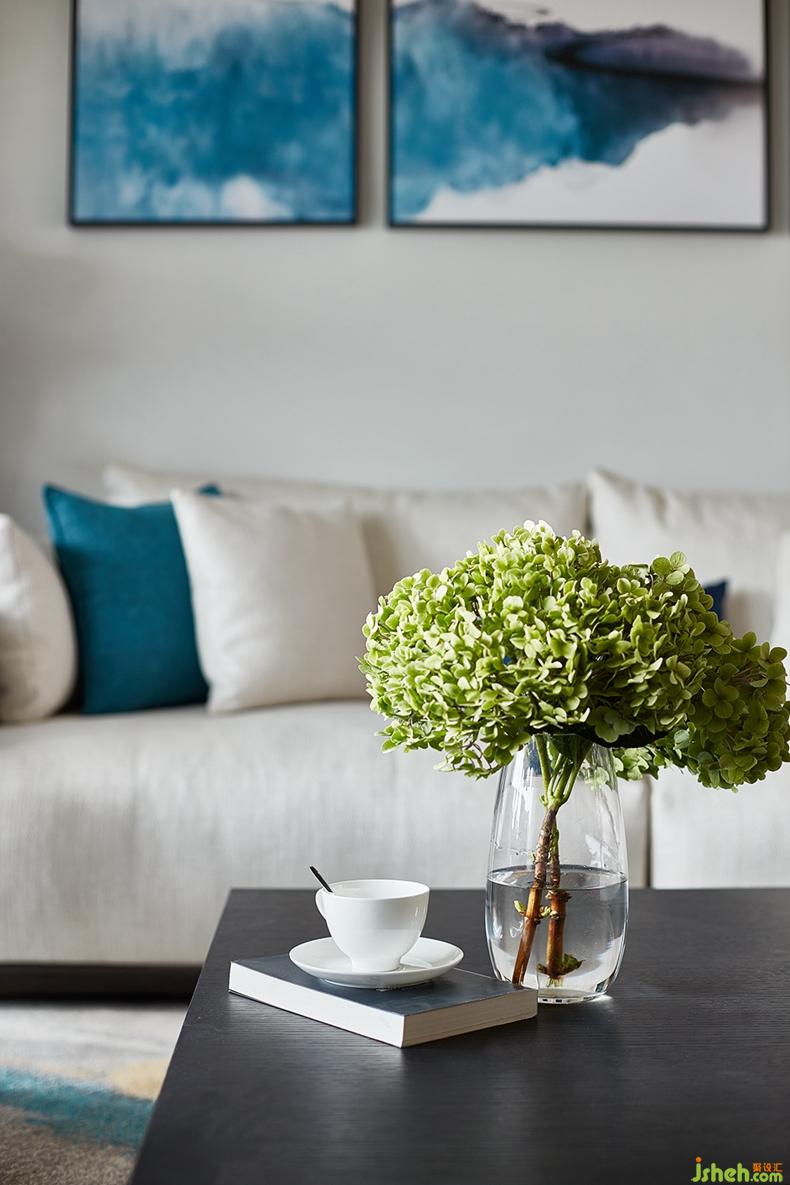 屋內(nèi)的一簇綠與屋外翠綠山景遙相呼應(yīng),自成一番頗有深意的意境之美。藍(lán)簾白紗、藍(lán)白腰枕與畫(huà)中水霧——藍(lán)與白為空間內(nèi)的一事一物錯(cuò)落上色,輕松勾勒出空間的層次感。室內(nèi)設(shè)計(jì)師