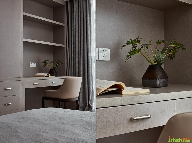 主臥初見時給人一種煙雨江南的視覺溫潤感,設(shè)計師在空間的功能布局上主次分明,色調(diào)把控上輕重有度,打造眼之所見的舒適。