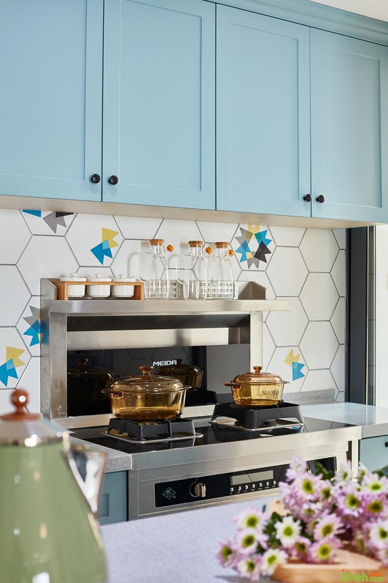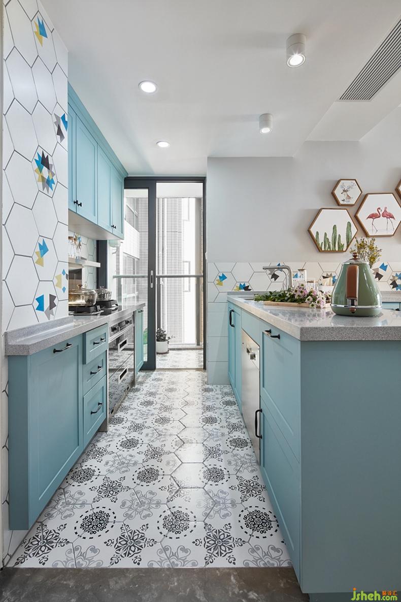 天藍(lán)色的運(yùn)用,讓收納柜頗多的小廚房完全不顯壓抑,明亮且通透。整個(gè)廚房既開(kāi)放也有半隔斷之感,設(shè)計(jì)師在色系、材料的把控上避重就輕,為小廚房營(yíng)造出一種“屋外冬日、屋內(nèi)夏日”的清新感。
