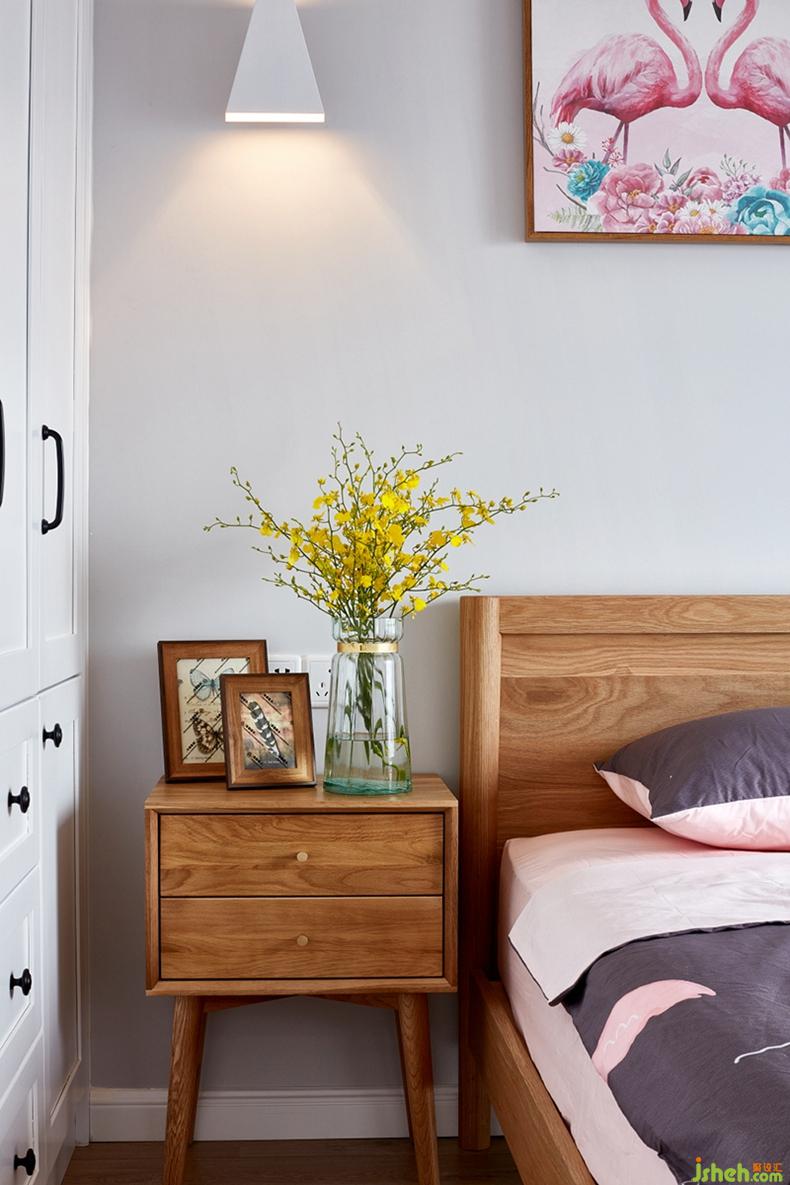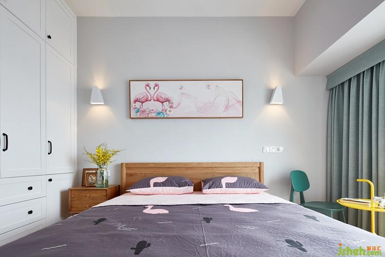 主臥:原木色的舒適、淺粉色的細(xì)膩與粉綠色的清新,搭配調(diào)和著給主臥染上了一抹治愈感。火烈鳥主題的空間自帶浪漫氣息,讓整個(gè)主臥功能性與審美性兼具。