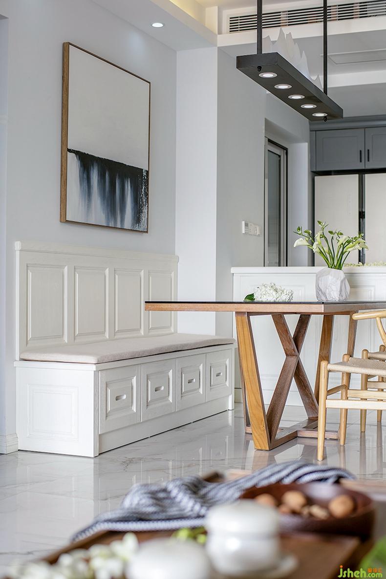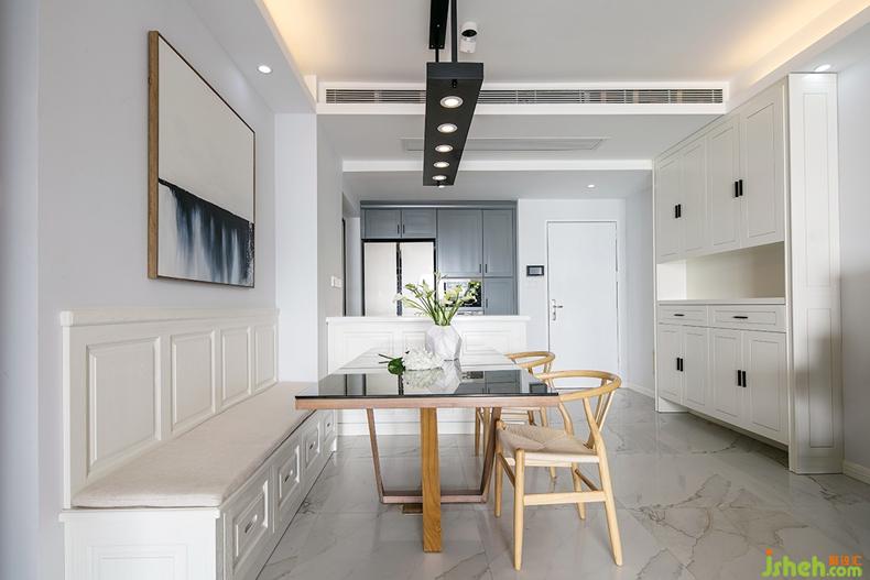 用餐區(qū)域作卡座設計,既削減了廚房門墻體的突兀感,又合理利用了空間。