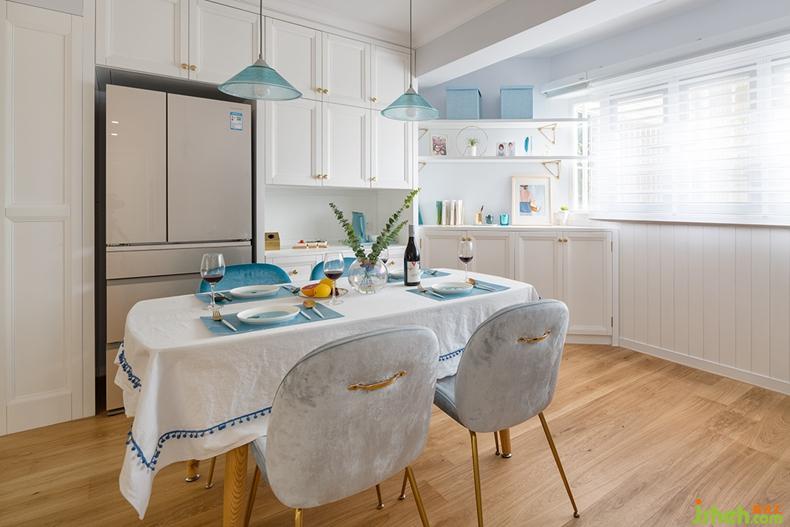 室內(nèi)設(shè)計師把陽臺封窗做成書桌,擴延到餐廳,使餐廳整體面積變大。玻藍餐燈與銀灰餐椅相映,在米白色柜櫥的背景下給人的感覺是明亮又有色彩感的。