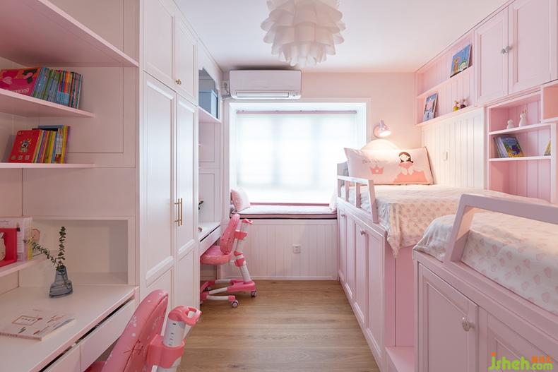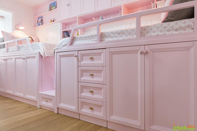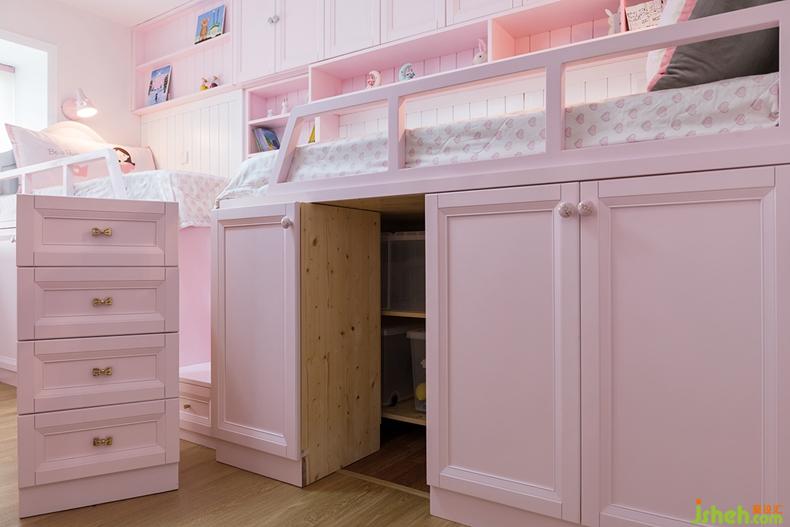 室內(nèi)設(shè)計(jì)師為雙胞胎專門打造出一片粉色世界,讓女孩們各自擁有著獨(dú)立的空間。床邊半高的柜子前端可以完全的拉出來更好的利用了內(nèi)部空間,功能齊全。