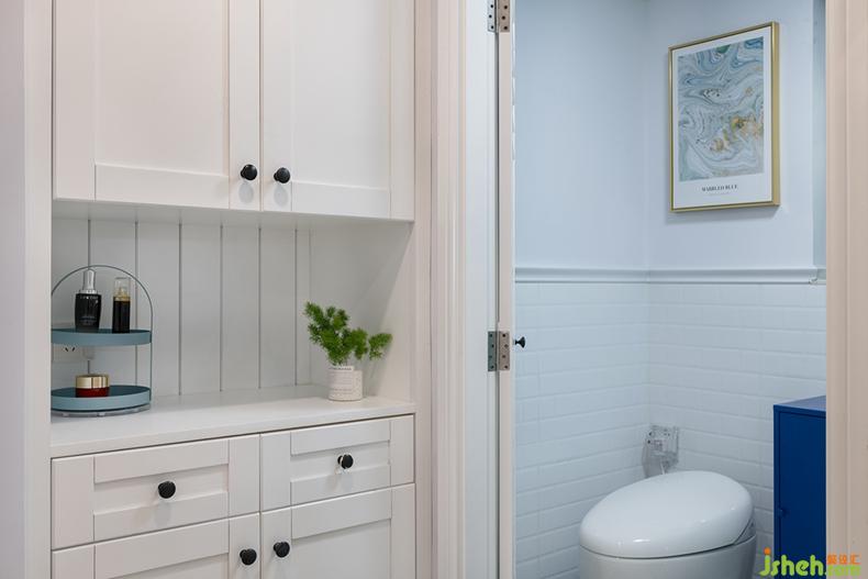 衛(wèi)生間進(jìn)行干濕分離的改造,提供了一個(gè)令人舒適愉悅的洗浴空間。浴室柜分層分區(qū)收納,方便日常瓶瓶罐罐的拿取。室內(nèi)設(shè)計(jì)師
