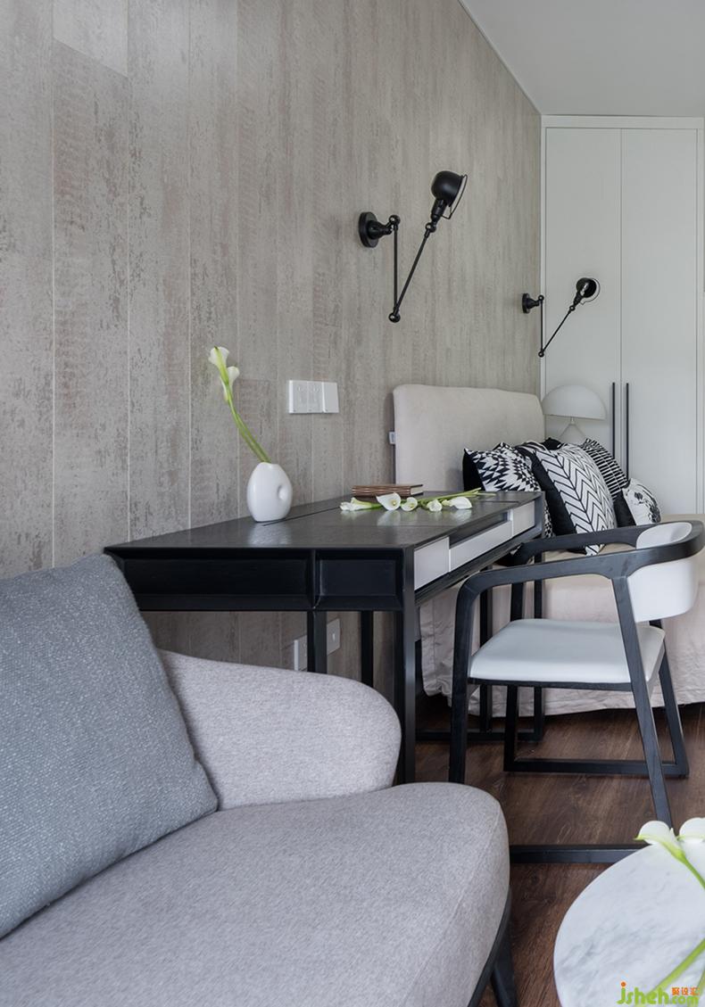簡約而不簡單的背景墻舒展了空間的視覺效果,整體明度偏高的黑灰白三色系打造出素凈澄明的空間格調(diào),家具和飾品之間和諧共生,令主臥更加精致優(yōu)雅。房間一角的書桌和沙發(fā),平日里可用作閱讀區(qū)。