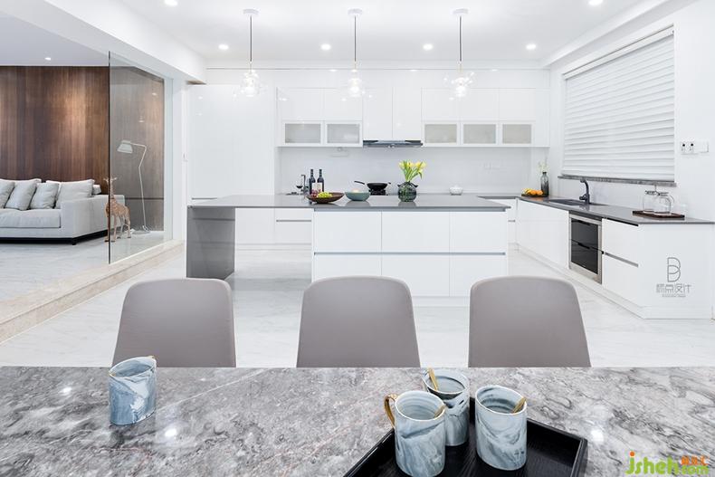 開放式餐廳將烹飪與用餐空間合二為一,成為最具生活滋味的區(qū)域。略帶暖意的大象灰結(jié)合純透的白,裝飾櫥柜、餐桌,打造出清雅立體的視感。