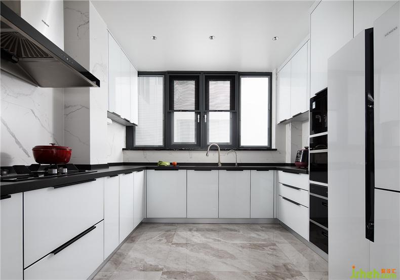 白色烤漆板的櫥柜與黑色的臺面結(jié)合,