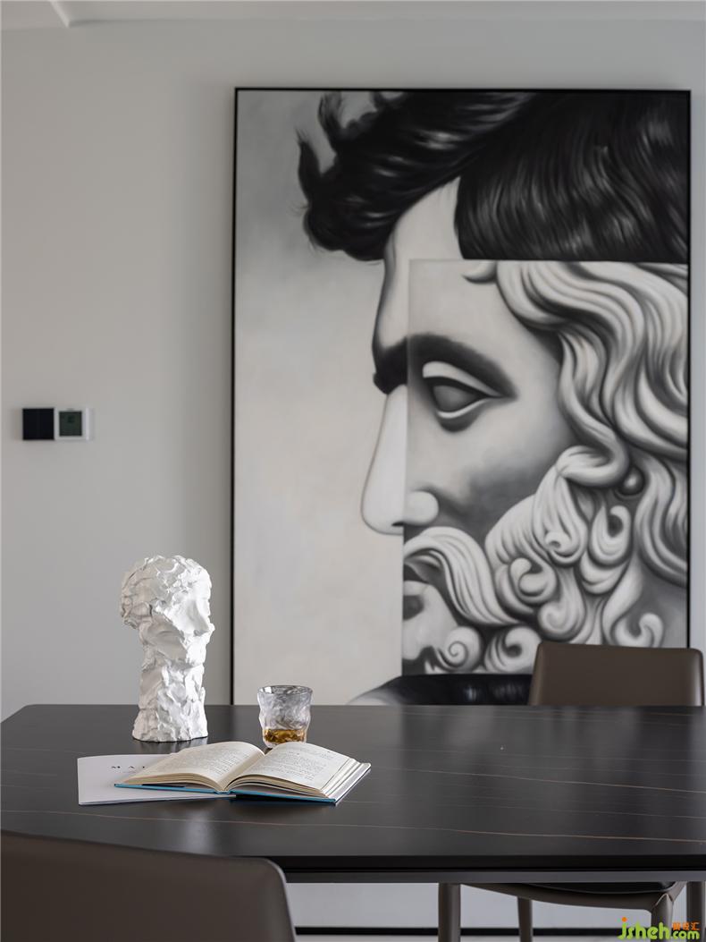 這樣的意蘊一直從客廳到廚房,順著視野及功能層次延續(xù)著到餐廳。只是相較于另一邊的精致細膩,巨大的現(xiàn)代抽象畫作以一種力量型的雕塑美,填充著空間