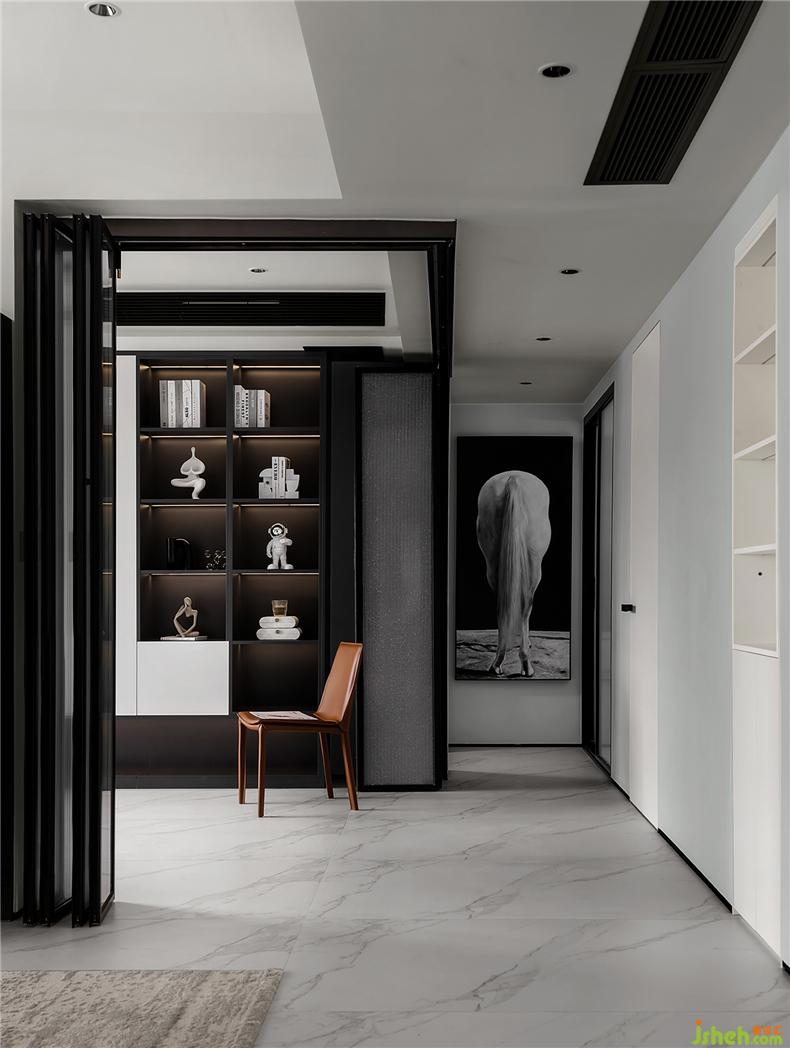 思想連續(xù)到書房,玻璃折疊門一方面引入自然光源,一方面擴寬過道,必要時還可以關上,保證隱私且安靜自在
