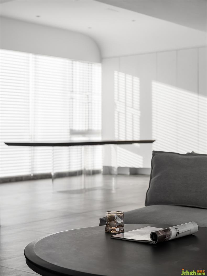 客廳、餐廳、廚房、書房,完全開放;三張簡(jiǎn)單的桌子、一套舒適的沙發(fā)、室內(nèi)設(shè)計(jì)師幾筆弧線、一系灰色,奠定空間的純粹,無(wú)需彰示什么,生活就在那里,以腳步起點(diǎn),光為色彩,隨心所動(dòng),繪出身體與精神上需要的所有。