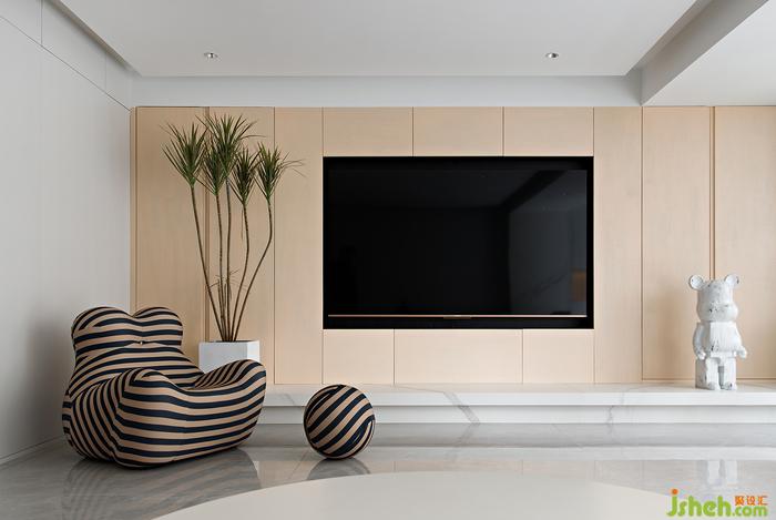 電視背景墻一整面的暗藏收納柜,大大滿足了收納需求。深圳家裝設計原木色的柜門與餐廳呼應,讓空間溫馨而舒適。