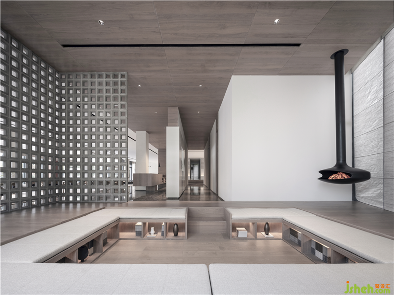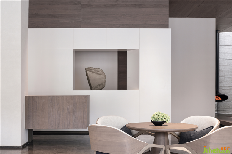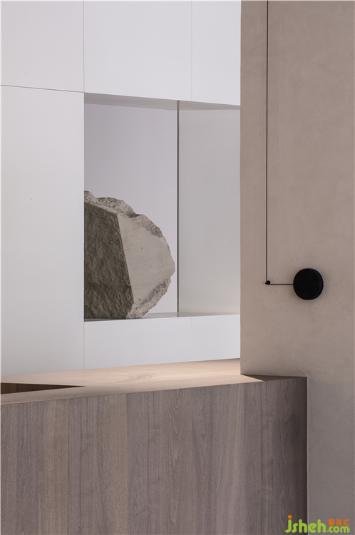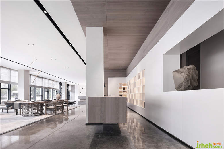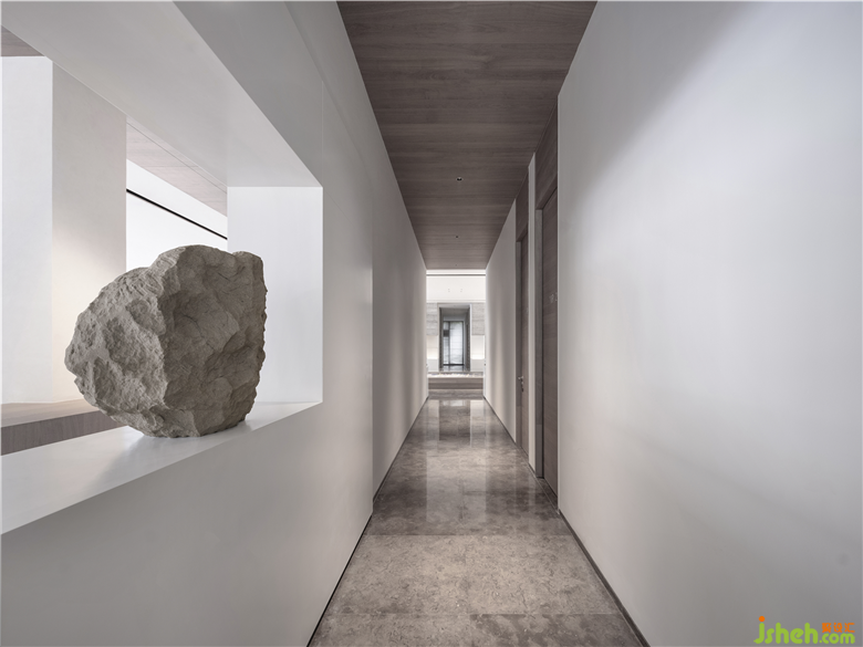 純粹的白色塊面與粗獷的原石雕刻,穿插出一種東方園林屏風(fēng)的“漏景”韻味。