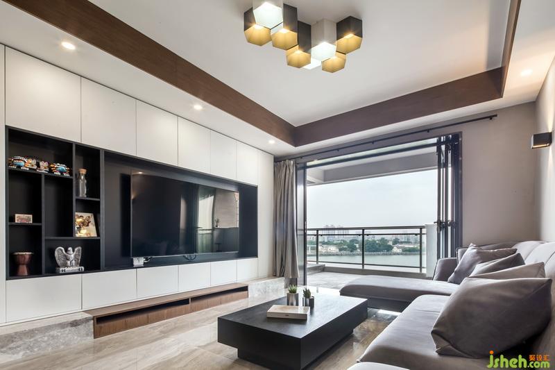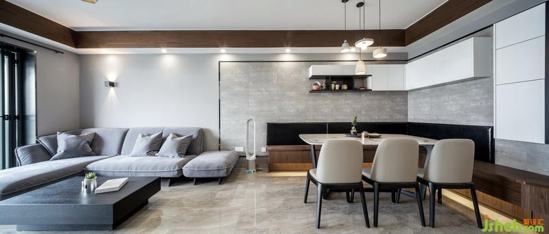在空間立面設(shè)計(jì)上,造型做到一減再減的設(shè)計(jì)手法,讓空間變大,家具盡量使用實(shí)木家具以保證綠色環(huán)保,電視墻面是滿墻的柜體,卻并沒有造成視覺的擁堵,因?yàn)榕c櫥柜的臺(tái)面處理成同一面,巧妙的弱化了存在感,色彩上采用大面積色塊,灰色配合了高質(zhì)感的家具材質(zhì),燈光使用暖黃光,符合業(yè)主的品味也不失一家四口的和諧溫馨。