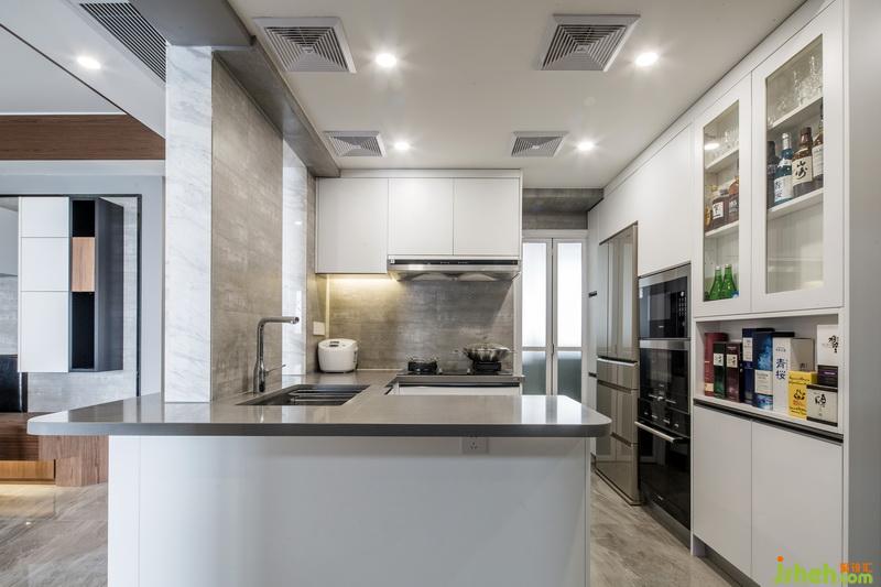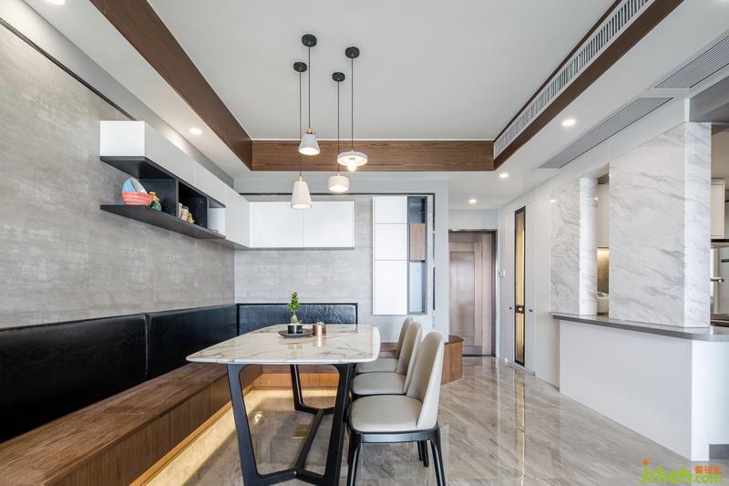 考慮到偶爾會(huì)大家庭聚會(huì),所以在餐廳的設(shè)計(jì),我采用的是組裝柜體卡座,餐廳是一個(gè),你給它很多細(xì)節(jié)它就會(huì)還你更多功能的地方,卡座采用柜體結(jié)構(gòu),可以儲(chǔ)物和儲(chǔ)存小孩玩具,平時(shí)可以當(dāng)作小孩玩具娛樂區(qū),卡座的延伸與玄關(guān)的換鞋椅成為一體,同時(shí)與半開放式廚房臺(tái)面形成一個(gè)新的動(dòng)線方向,避免了入戶門直接對(duì)沖陽臺(tái)推拉門的風(fēng)水問題,也增加了廚房的實(shí)用功能,櫥柜斜形臺(tái)面,主要提供放置業(yè)主的隨手物件,例如鑰匙,錢包,臺(tái)面上的兩面墻體,一是具有裝飾性,同時(shí)也能很好的遮擋日后廚房使用起來的一個(gè)凌亂現(xiàn)場(chǎng),中間的留空,可提供女主人與客廳家庭成員的一個(gè)溝通,也能起到傳菜的功能。