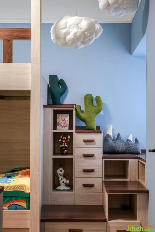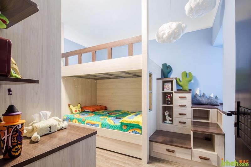 小孩房為節(jié)省空間,采用了上下鋪設計,利用了飄窗臺做了個異性轉角臺階,增加了空間的趣味性。
