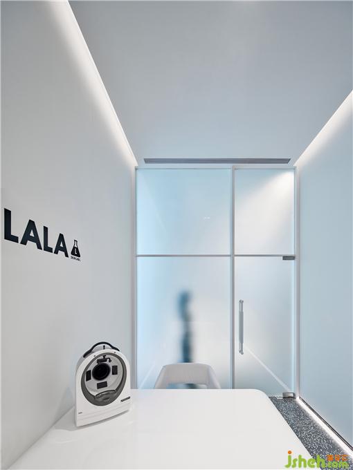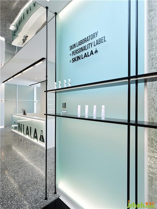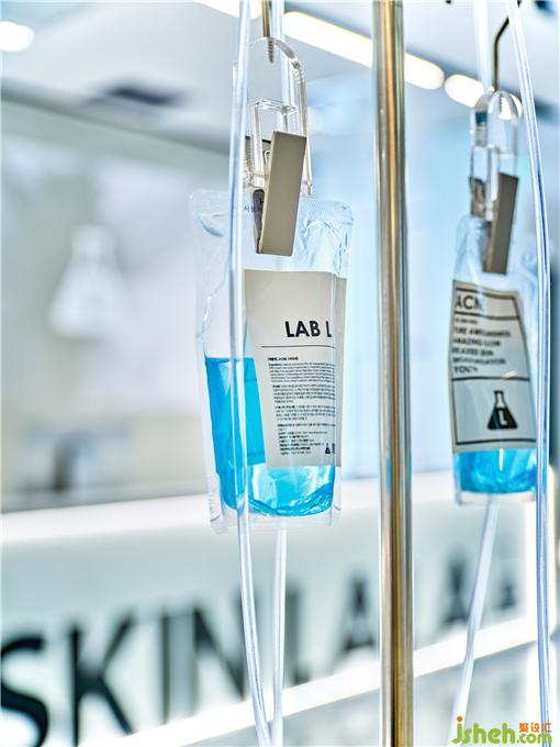 局部空間通過玻璃磚、玻璃材質(zhì),SPA設(shè)計滿足完整區(qū)域劃分及合理動線的同時,引入光線,令小空間不局促,并使得內(nèi)外關(guān)系更具互動性。同時在產(chǎn)品陳列上,品牌深耕研究的技術(shù)結(jié)晶也被完整展現(xiàn),通過輸液袋,針劑等科學(xué)醫(yī)療的形式凸顯品牌差異化。這也是SKINLALA最大的特色之一,為每個人個性化定制,現(xiàn)場調(diào)配最有針對性的肌膚喚醒方案。