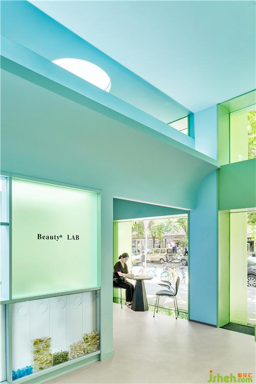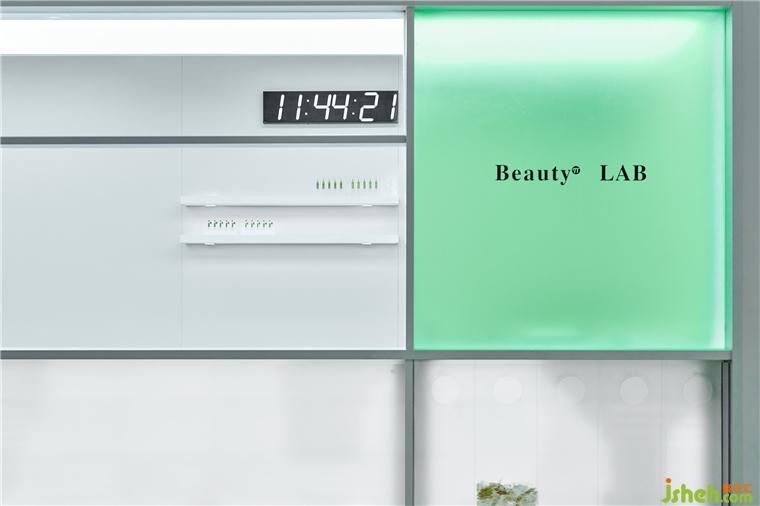 公開透明的調配是Beautyπ 云朵白的體驗特色,我們將前臺、收銀、調配間整合,并連接后勤空間,以LAB的形式成為大廳區(qū)域的主視覺。顧客可以從窗口看到療膚精華調配的全過程,并在美容體驗結束后,療膚中心設計將未用完的精華帶回家,或將空瓶投入吧臺正面的投放口。動態(tài)燈箱播放的光影畫面與戶外陽光灑下的斑駁樹影相呼應,并可以更換素材。