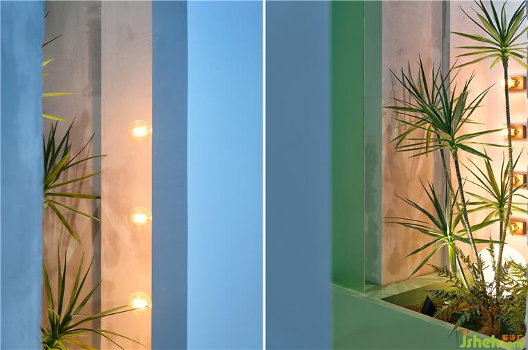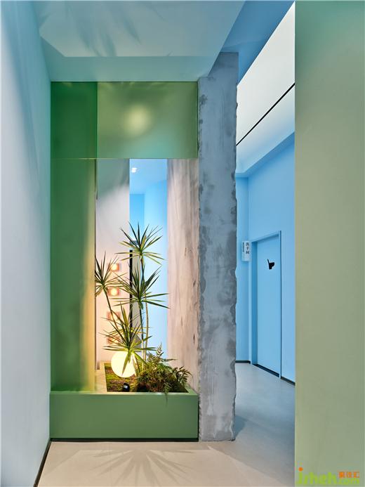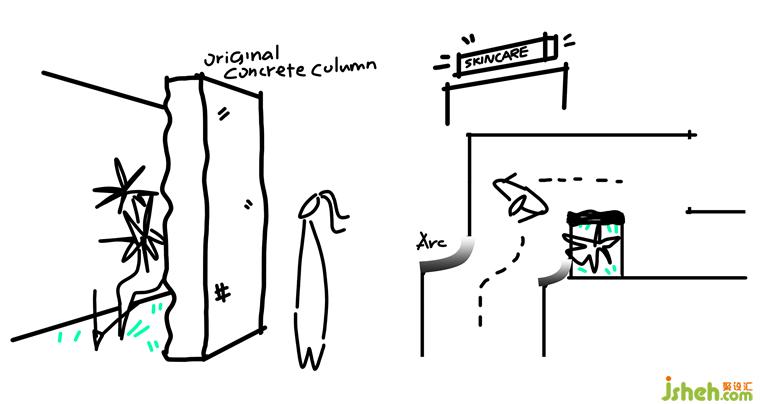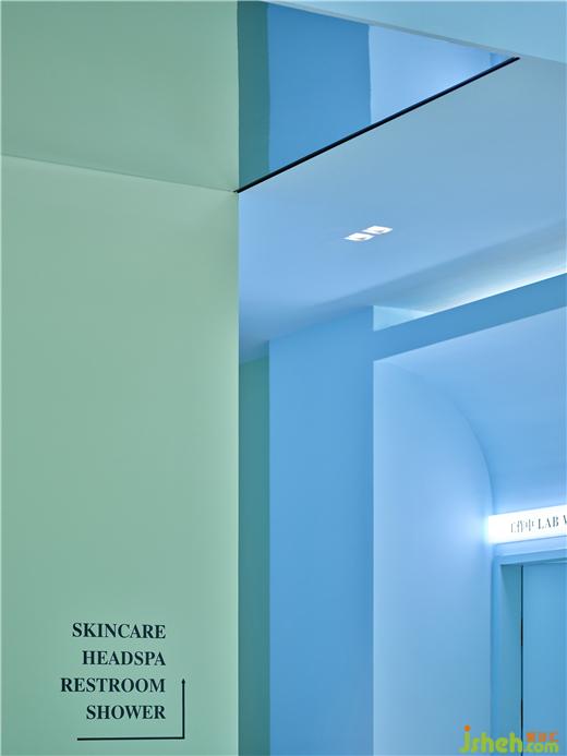 場地層高較高,但受原始結構的限制無法搭建二層,因此我們通過局部體塊穿插打造視覺上的假二層,豐富空間層次。療膚中心設計局部可上人用于存放物料,空調口檢修等功能。入口處的展示區(qū)用于品牌文化的及部分產(chǎn)品的展示。