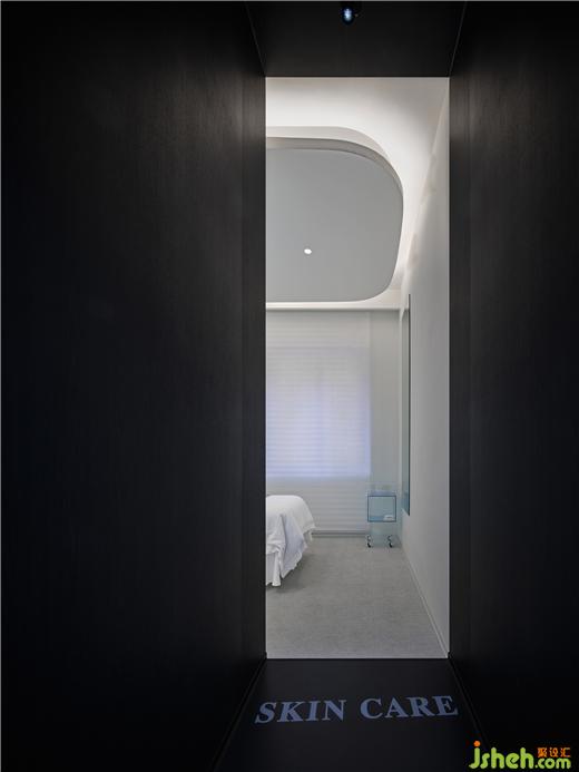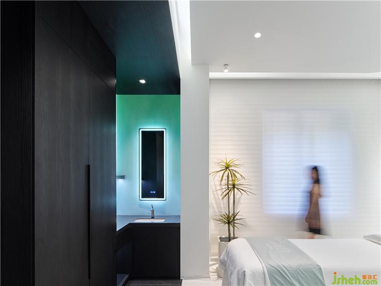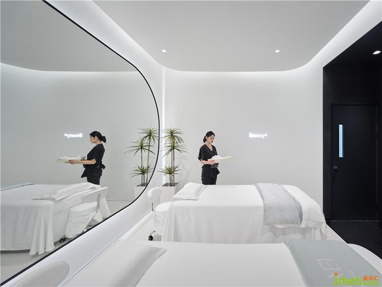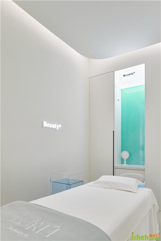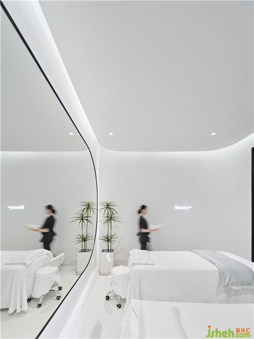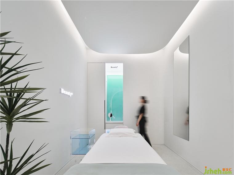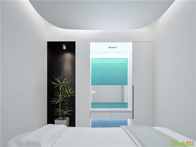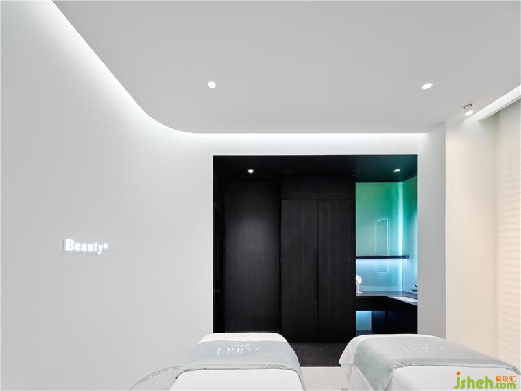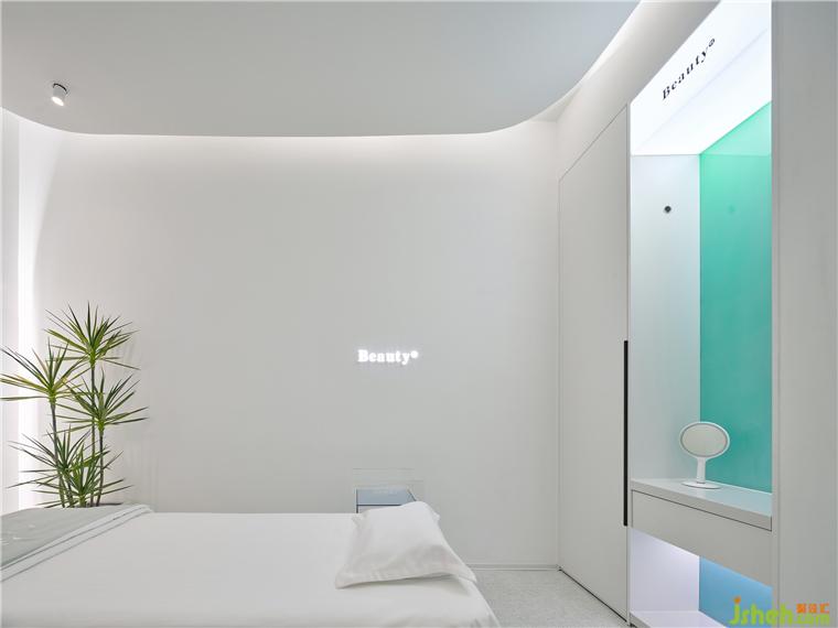 療膚中心設(shè)計利用色彩和材質(zhì)強(qiáng)化功能分區(qū),增大房間視覺格局。智能控制模塊設(shè)計了準(zhǔn)備、體驗中、體驗結(jié)束等不同模式的燈光亮度,并可以對音樂、投影、空調(diào)等進(jìn)行調(diào)節(jié)。