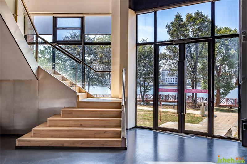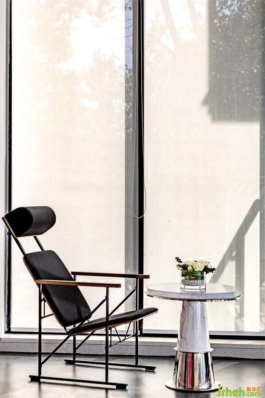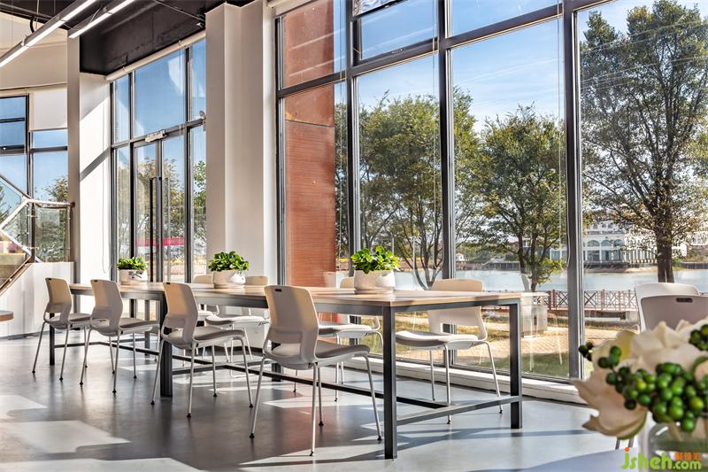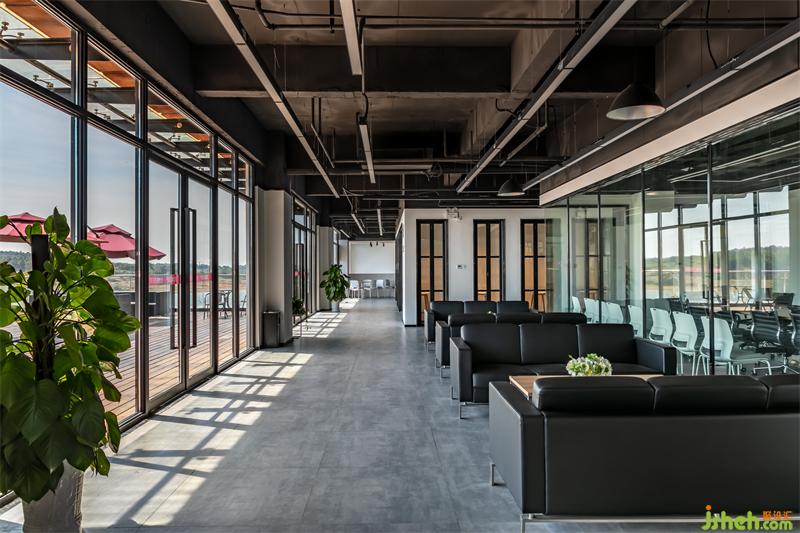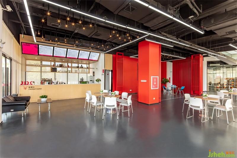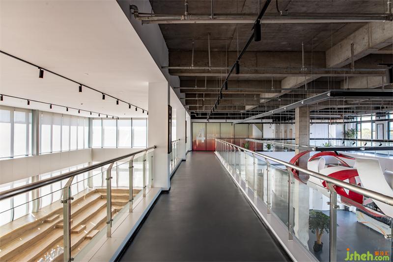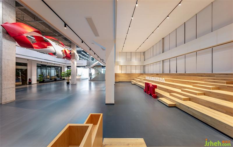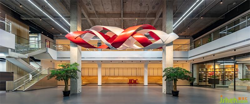 穿過(guò)展廳,空間重新置入創(chuàng)意社區(qū)及共享辦公的功能,對(duì)場(chǎng)地進(jìn)行相應(yīng)設(shè)計(jì),辦公室設(shè)計(jì)以激發(fā)場(chǎng)地的空間潛力,賦予它作為城市創(chuàng)意社區(qū)的新生。現(xiàn)代主義意蘊(yùn)的紅白相間吊空裝置,凝固了最有張力的瞬間,提升了整個(gè)創(chuàng)意社區(qū)的藝術(shù)趣味。