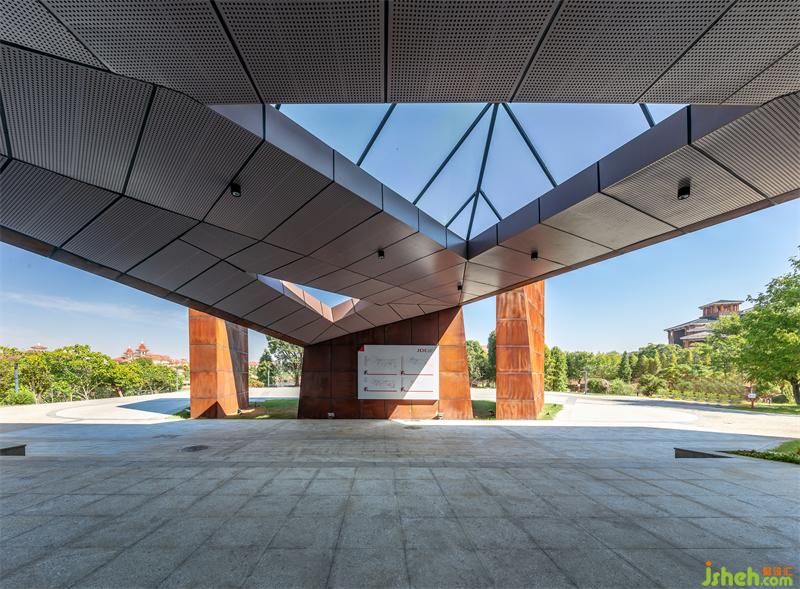 原有建筑的頂部涼亭,加以鋼構(gòu)玻璃做現(xiàn)代造型,配合燈光設(shè)計(jì),當(dāng)夜幕降臨,塔樓向天空投射具有力量的光束,就像是象征未來創(chuàng)新的希望焰火,直射天空,呈現(xiàn)一種“破土而出、豁然天成”的建筑藝術(shù)效果。