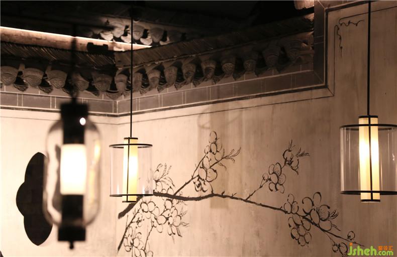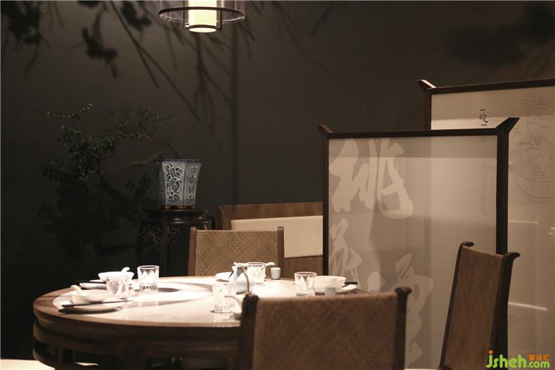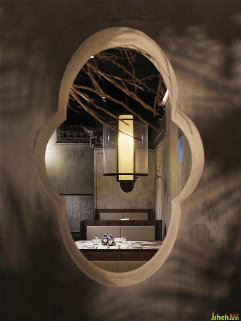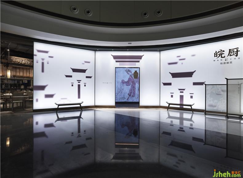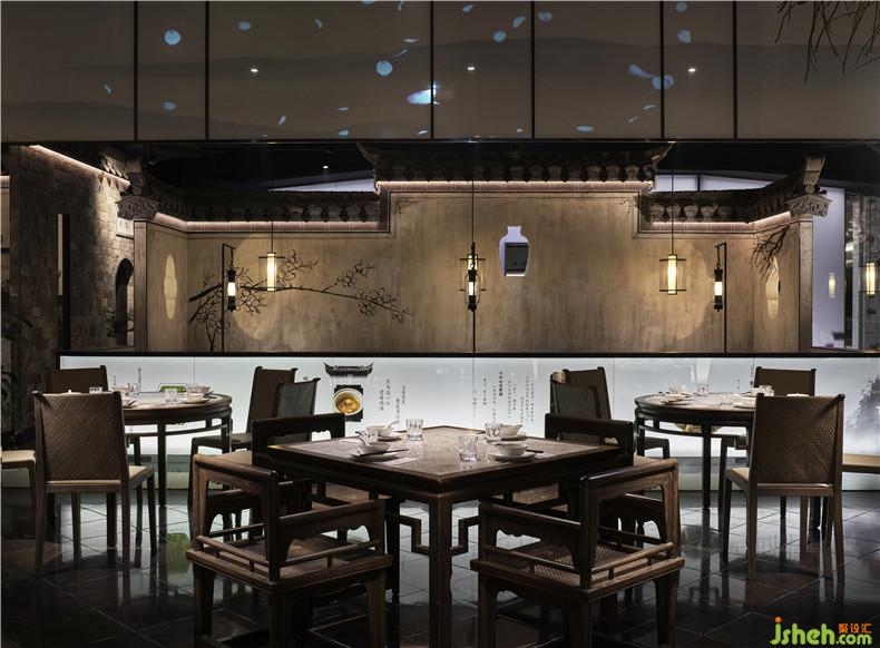 皖廚桃花潭外立面運(yùn)用整面玻璃燈光外墻,國(guó)畫寫意結(jié)合現(xiàn)代燈光設(shè)計(jì),繪制抽象徽派建筑線條。餐廳內(nèi)沿用徽派建筑馬頭墻墻體,并于高地懸掛紗幔以聲光電技術(shù)投影桃花瓣飄落場(chǎng)景,室內(nèi)多以中式園林框景手法結(jié)合燈光設(shè)計(jì)繪制陰翳感,金磚地面營(yíng)造出水的倒影,拉伸空間的維度。深圳餐廳設(shè)計(jì)
